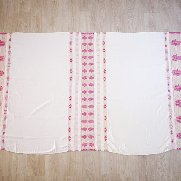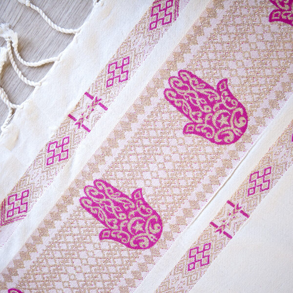 HOUSE OF GALILEE Handmade White Throw with Bright Pink Hand of Fatima and Gold Trim