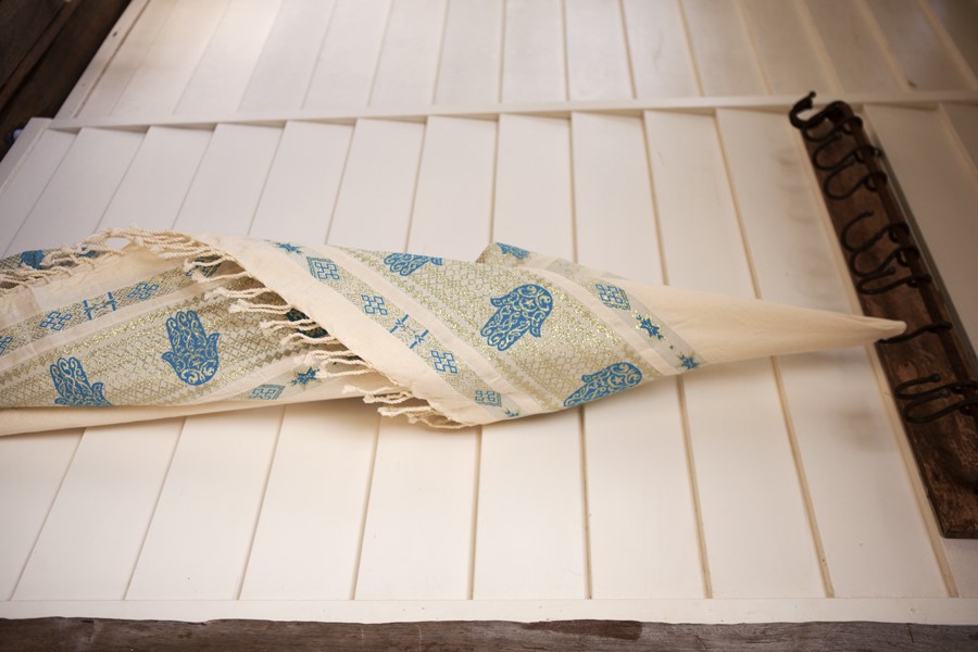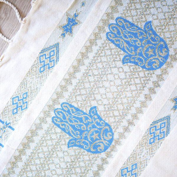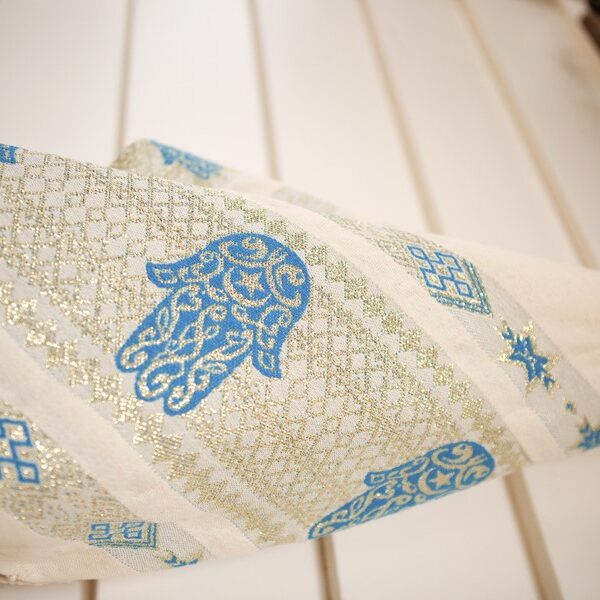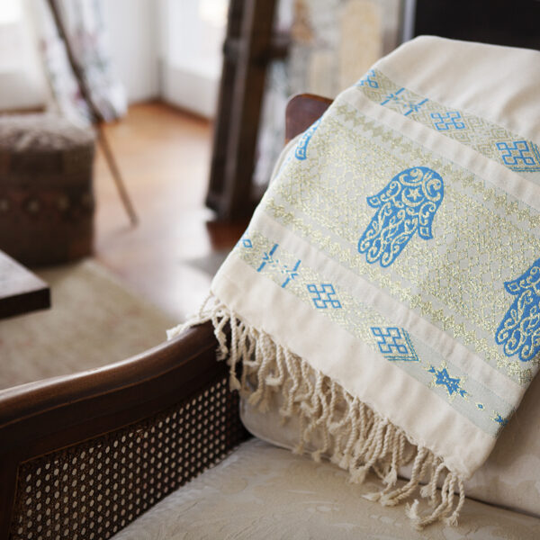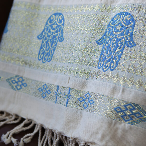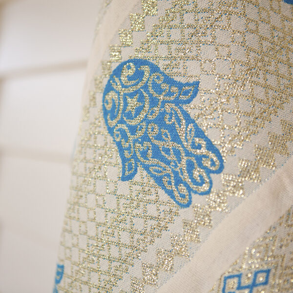 HOUSE OF GALILEE Handmade White Throw with Royal Blue Hand of Fatima and Gold Trim